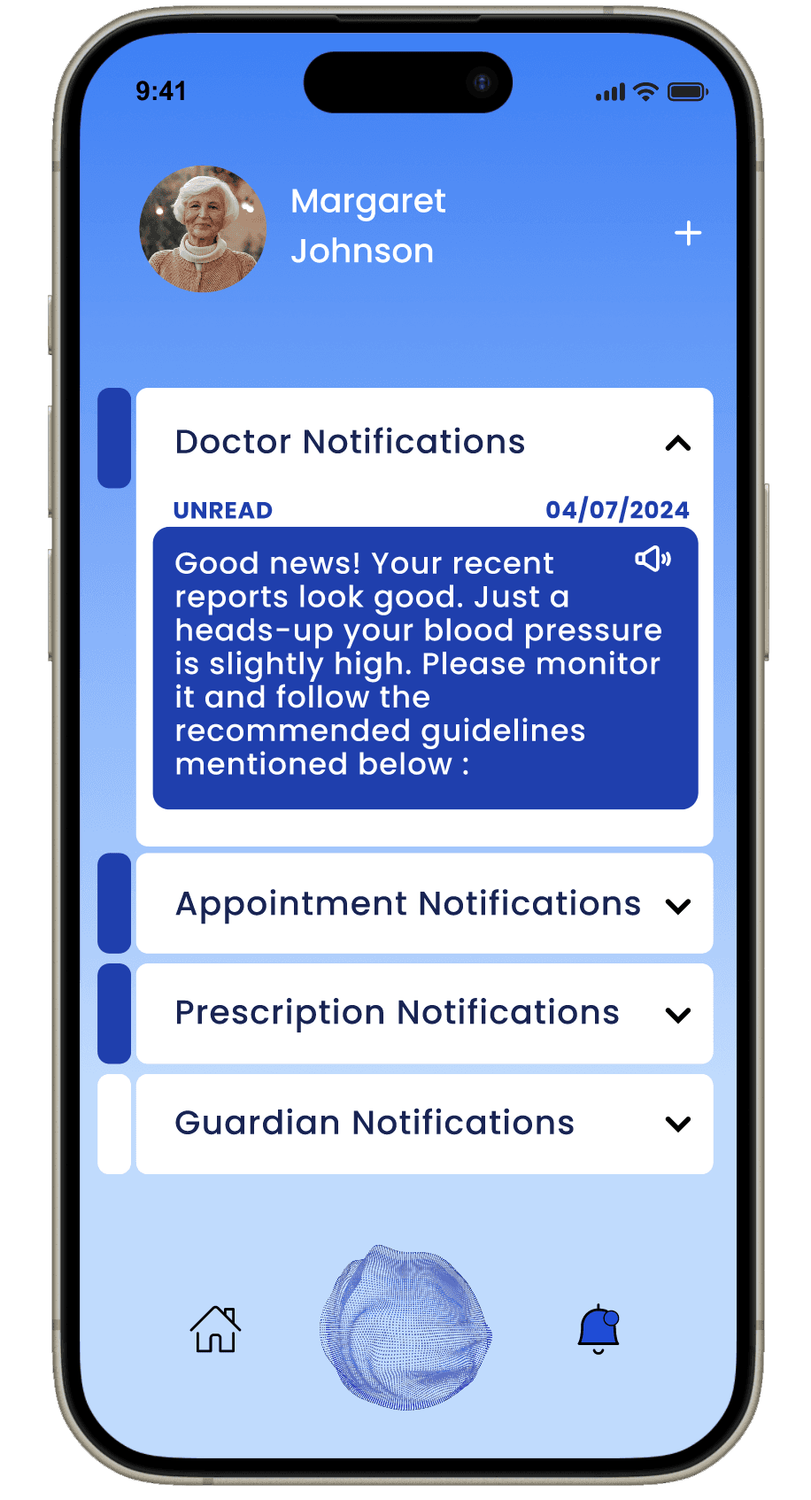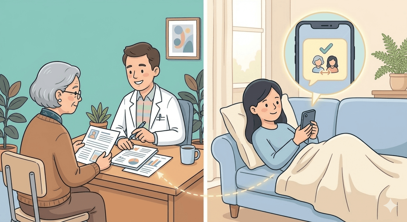 After a visit, prescriptions and appointment changes sync automatically. Her daughter gets notified without Margaret having to remember to call.